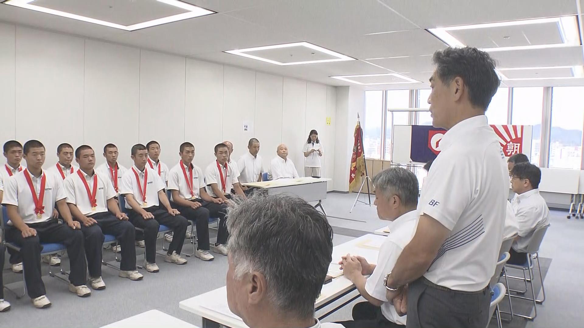 壮行会には第106回全国高校野球選手権大会に出場する報徳学園の監督や選手など24人が出席しました。