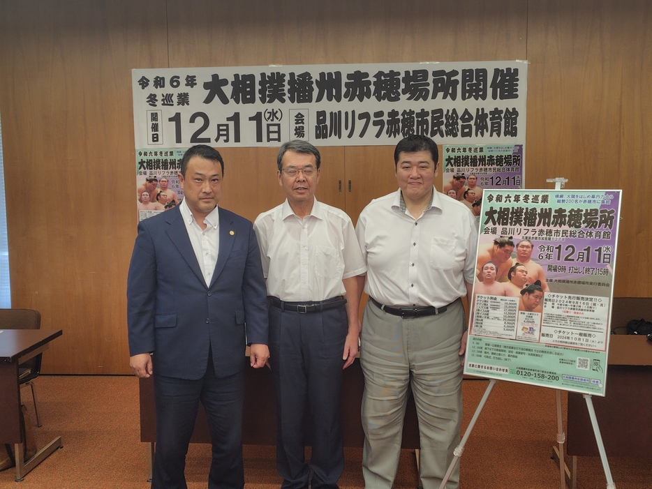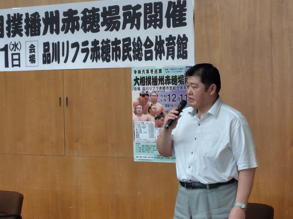 これは兵庫県赤穂市が定例会見に合わせ明らかにしたもので、会見には赤穂市の牟禮市長と日本相撲協会の大鳴門親方(元大関・出島)が参加しました。