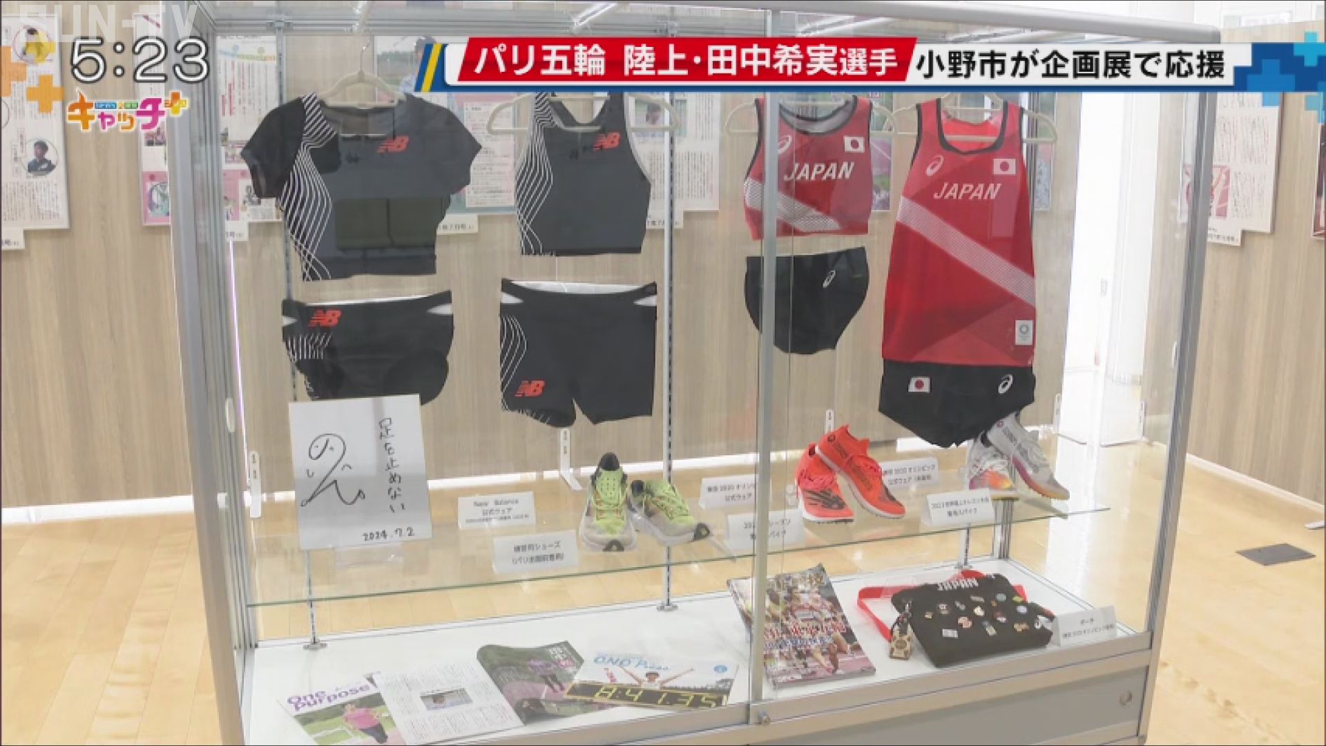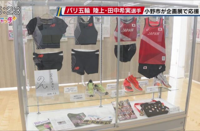 また、小野市役所では田中選手ゆかりのグッズを紹介する企画展が開かれ、東京オリンピックの公式ウエアや昨シーズン、田中選手が使用していたスパイクなどが展示されています。