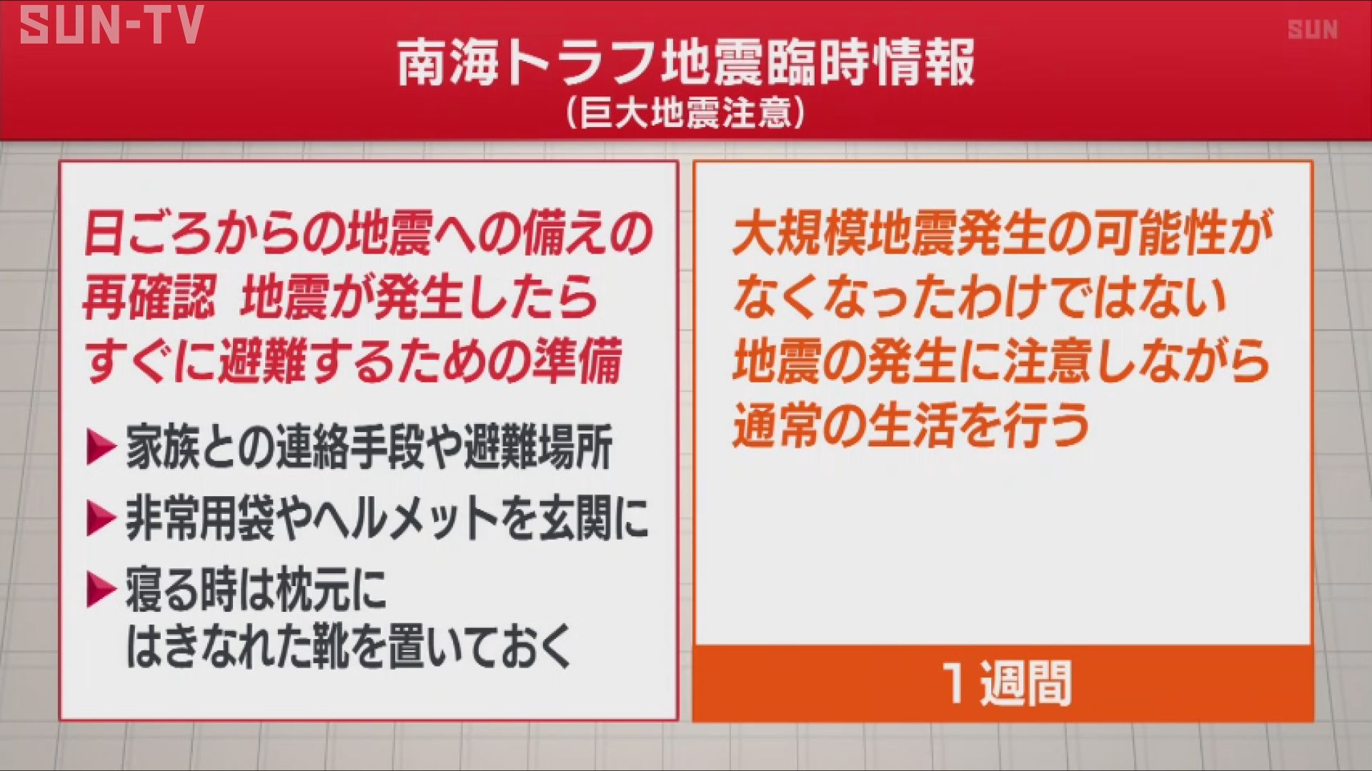 検討会の結果、気象庁は、南海トラフ地震の想定震源域とされる東海沖から九州沖では、「大規模地震の発生可能性が平常時に比べて相対的に高まっている」として「巨大地震注意」とする臨時情報を発表しました。