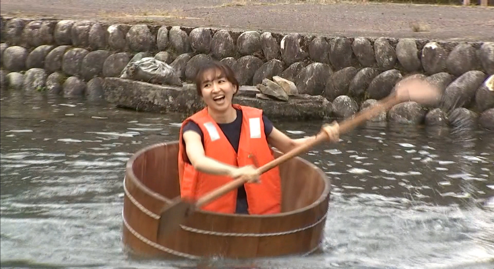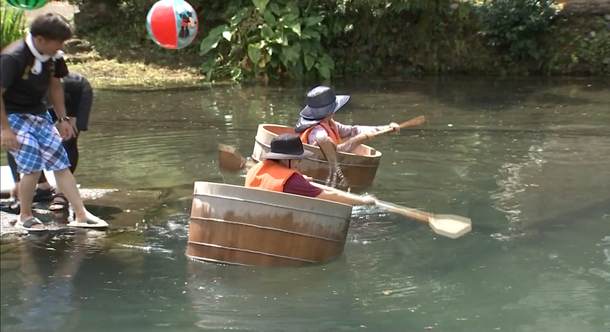 連日、暑い日が続く中、兵庫県新温泉町では8月10日、町内の池をたらいに乗って往復する涼しげなたらいこぎ競争が行われました。