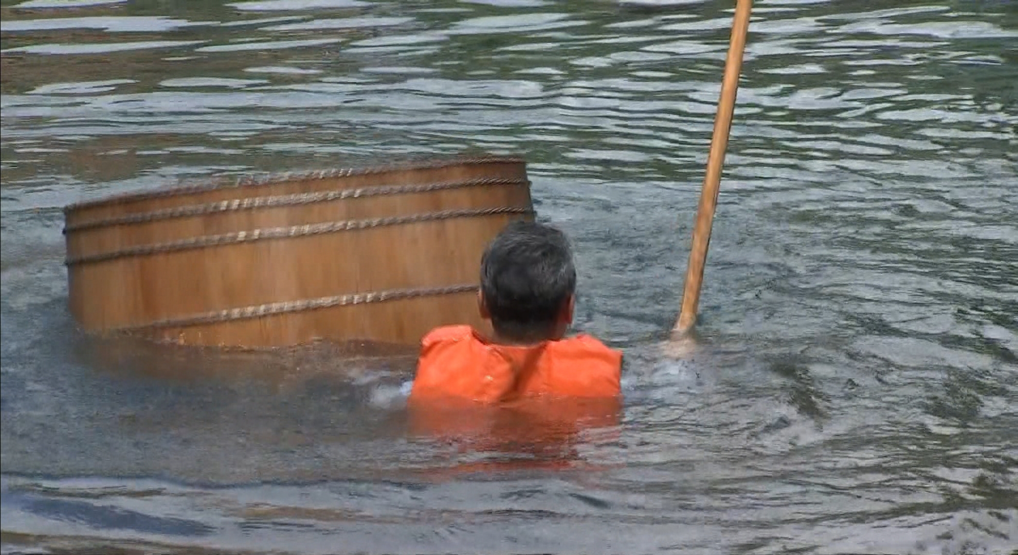ルールは直径およそ1メートル深さ70センチの酒造りにも使われる木製のたらいに乗り、それぞれおよそ30メートルのコースを往復し、そのタイムを競うというもので、今回は16人が参加。