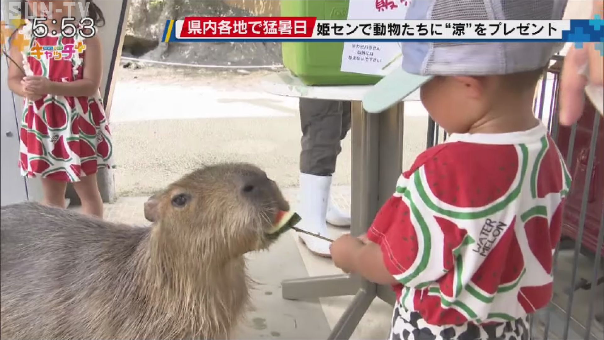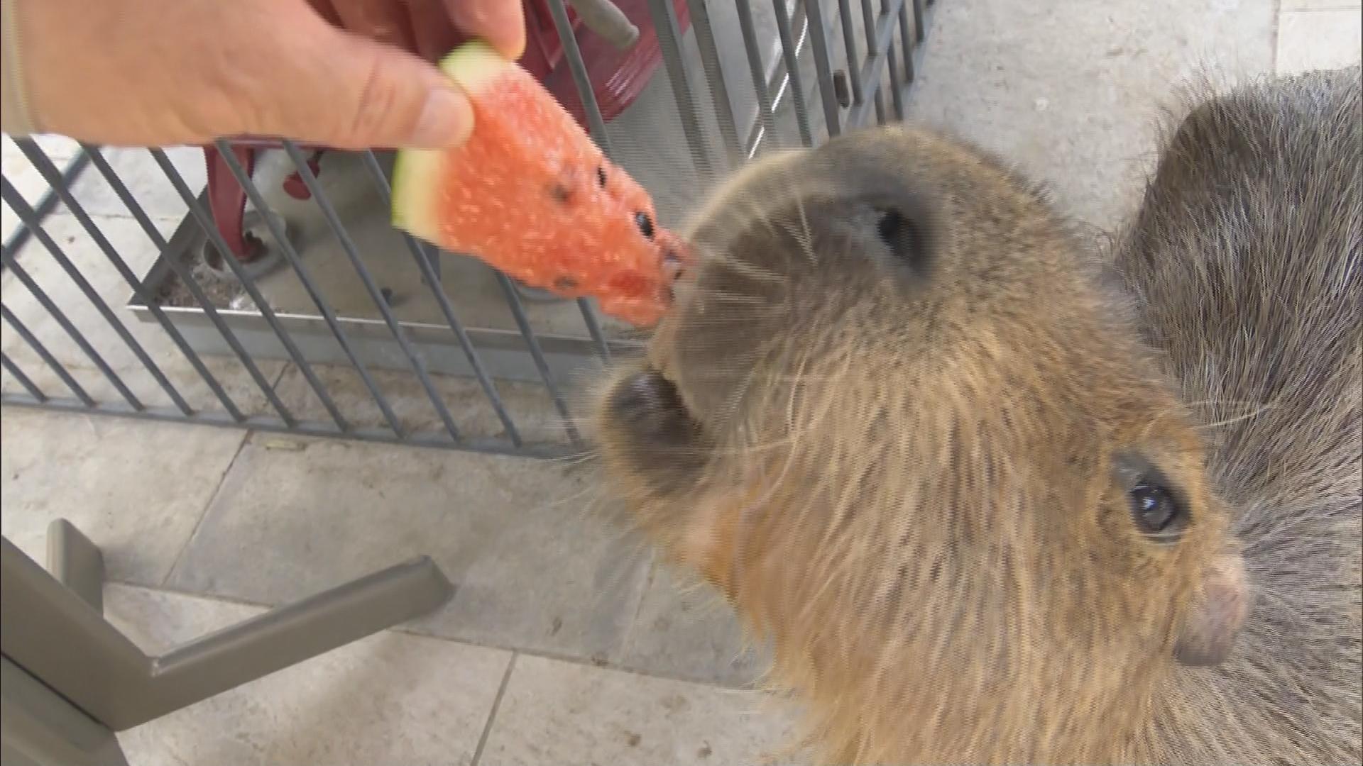 カピバラにはスイカを直接与えることもでき、訪れた人たちは少し涼しそうになった動物たちを見て楽しんでいました。