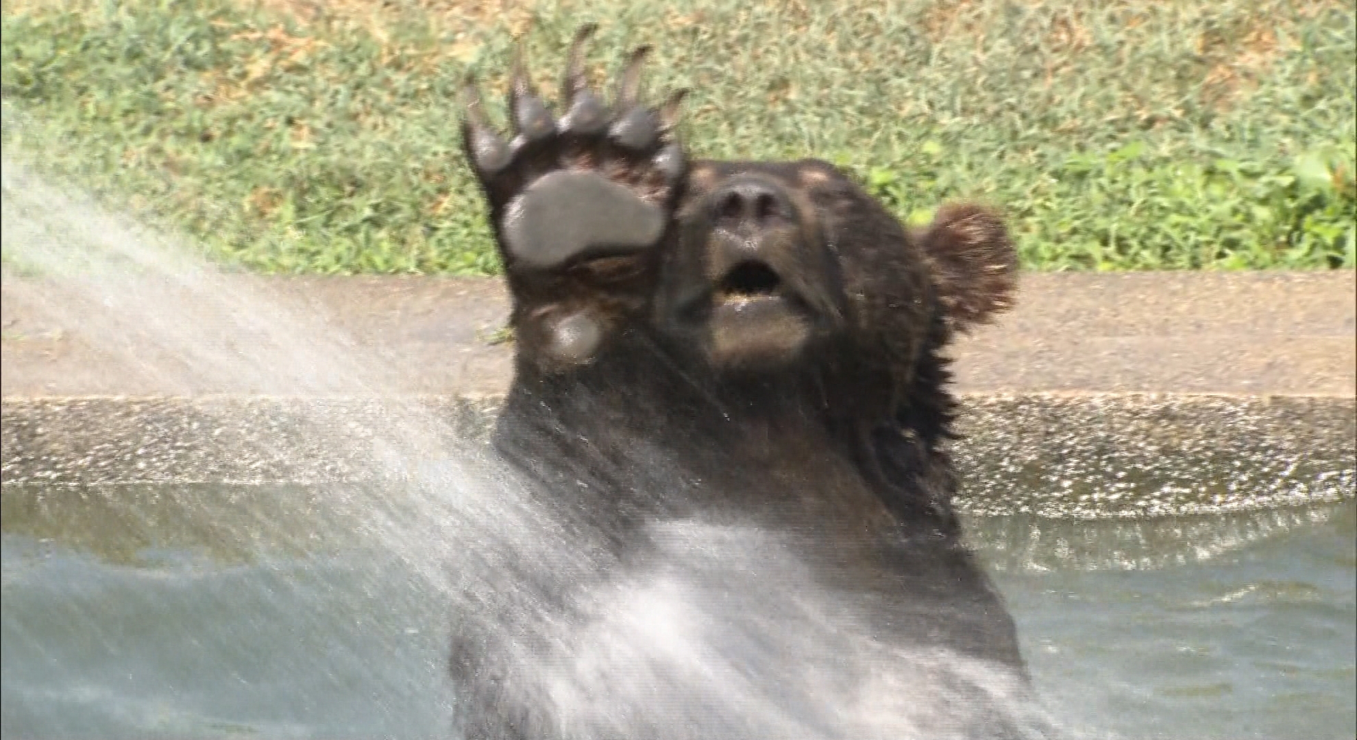 水をかけられて気持ちよさそうなエゾヒグマ。厳しい暑さの中、涼しさを求めています。