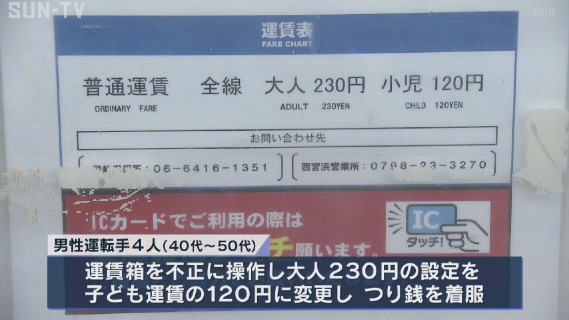 阪神バスによりますと、着服していたのは40代から50代の男性運転手4人で、運賃箱を不正に操作し、大人230円の設定を子ども運賃の120円に変更する手口で、つり銭を着服していたということです。