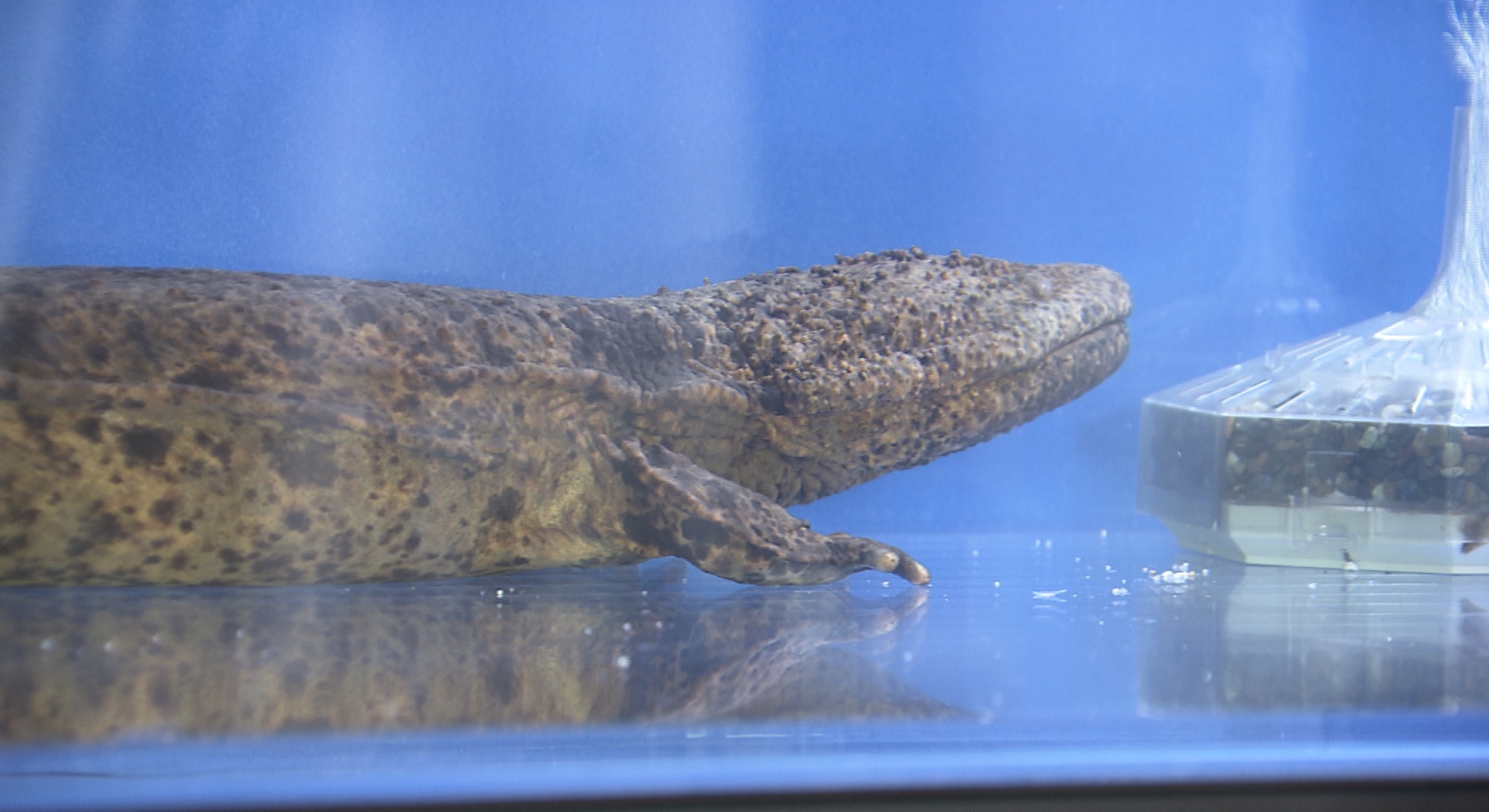 センターでは、2024年7月に特定外来生物に指定された、国産オオサンショウウオとチュウゴクオオサンショウウオの交雑個体も、8月18日から公開されています。