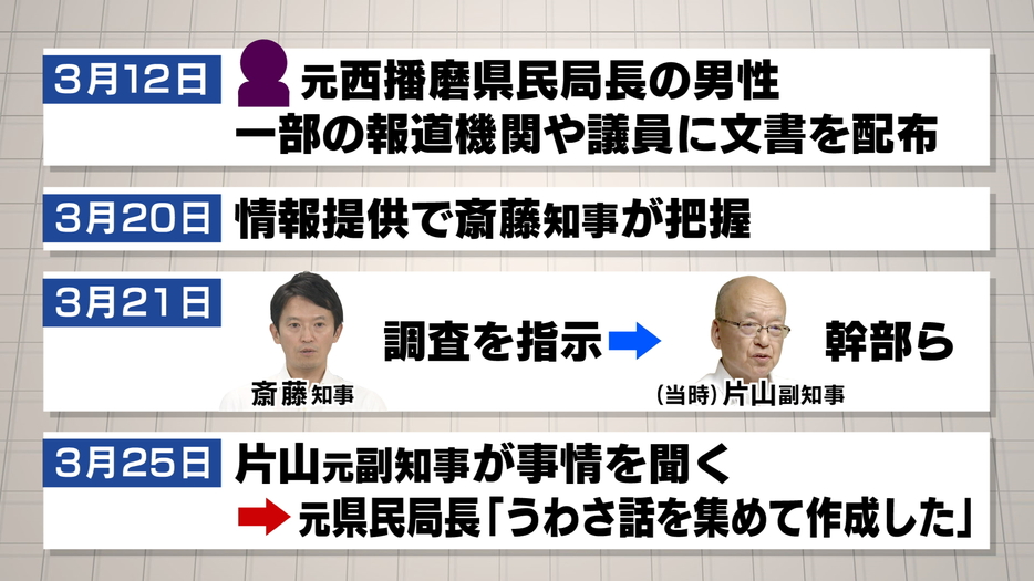 元西播磨県民局長の男性は、3月12日、文書を一部の報道機関や議員に配布しました。情報提供によって斎藤知事は3月20日に文書を把握。翌日の21日に当時の片山副知事や幹部職員と協議し、調査を指示しました。3月25日に片山元副知事らが男性から直接事情を聞き、県は男性の公用パソコンを預かり調査を行いました。この時、斎藤知事は、男性が文書の作成を認めたこと。また、「うわさ話を集めて作成した」と供述したことを片山元副知事から報告を受けたそうです。
