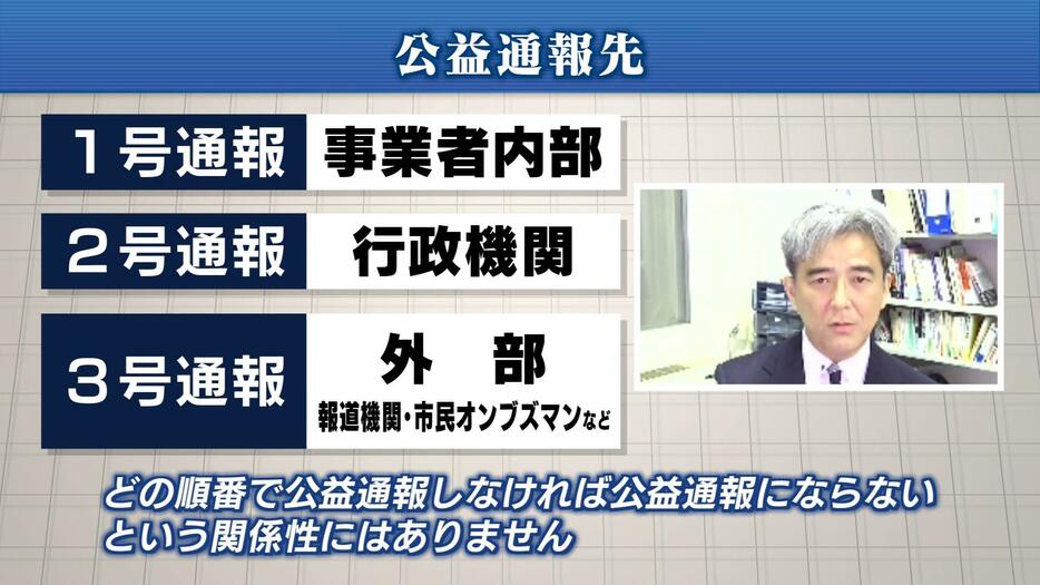 「どの順番で公益通報しなければ公益通報にならないという関係性にはありません。今回行われたように誰が告発者なのか探索が行われて不利益な扱いを受けることが見え見えであるような場合は、これは報道機関に直接内部告発することが公益通報者保護法の保護しようとする公益通報に該当しうる」
