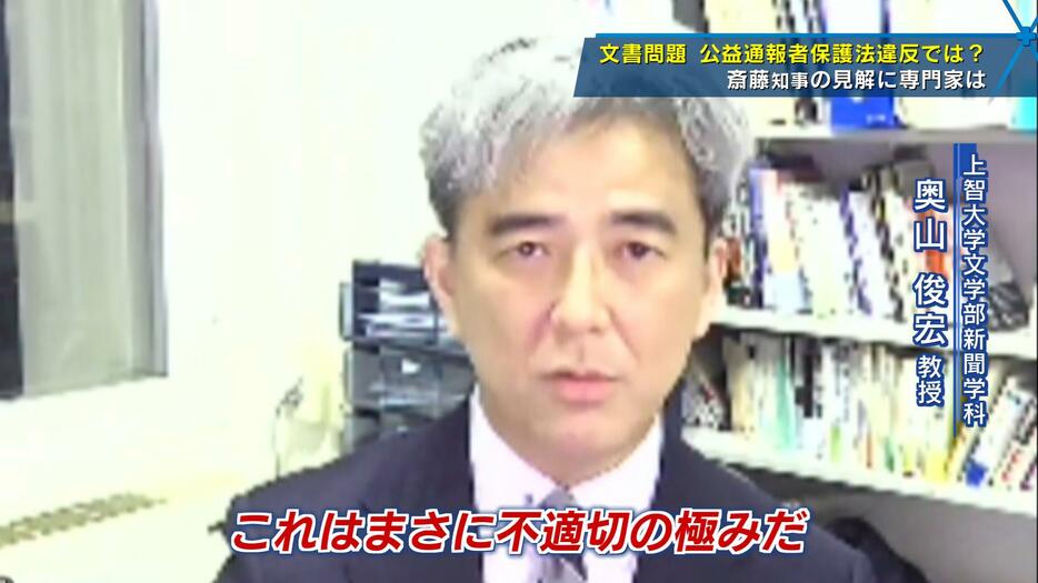 元朝日新聞記者で内部告発に詳しい上智大学文学部の奥山俊宏教授は、兵庫県の認識に誤りがあると指摘します。