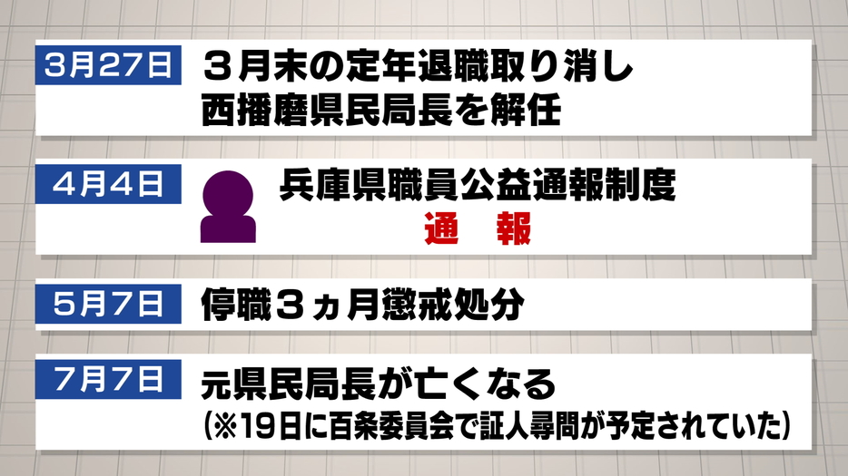 男性は、3月末に定年退職を迎える予定でしたが、3月27日、県は男性の定年退職を取り消し、西播磨県民局長を解任しました。男性は、4月4日、兵庫県職員公益通報制度の窓口に通報。しかし、その結果を待たずして、5月7日、県は、内部調査によって「核心的な部分が事実と異なる」などとして、男性を停職3カ月の懲戒処分としました。この問題を受けて6月13日、兵庫県議会は百条委員会の設置を決定。7月19日に男性の証人尋問が予定されていましたが、7月7日、元西播磨県民局長の男性は自ら命を絶ちました。
