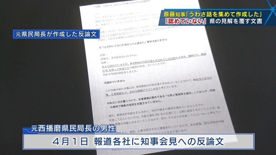 本人が「うわさ話を集めて作成したもの」と認めたという兵庫県の主張を覆す文書が存在します。「嘘八百」という会見の5日後の4月1日、元県民局長は、報道各社に反論文を送っていました。