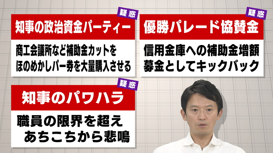金融機関への補助金増額の見返りとして、阪神・オリックスの優勝パレードの協賛金の寄付をさせた疑惑や斎藤知事のパワハラ疑惑など7つの項目が記され、兵庫県は、内部調査から「核心的な部分が事実でない」と否定しています。