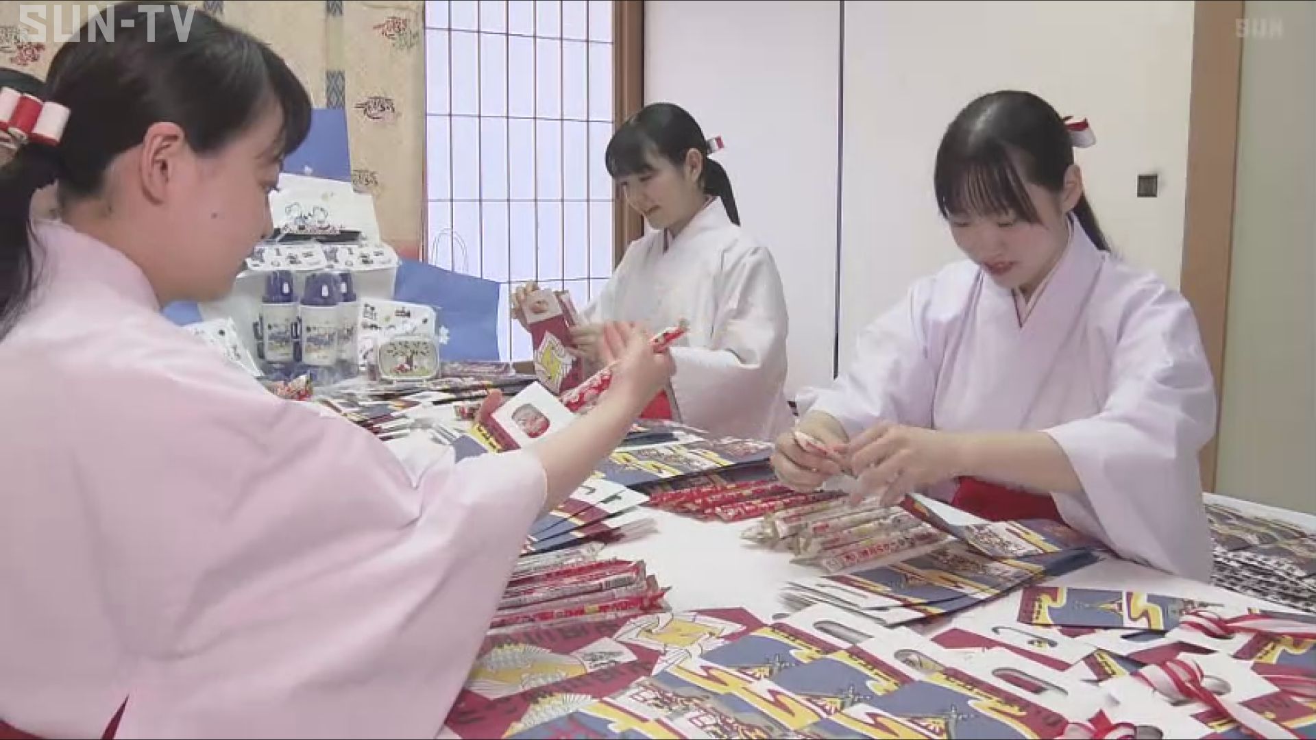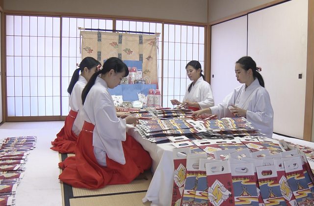 ことしは9月1日から配る予定で、はかま姿の巫女たちが健康と長寿を願う、紅白の千歳飴を丁寧に袋に詰めていました。
