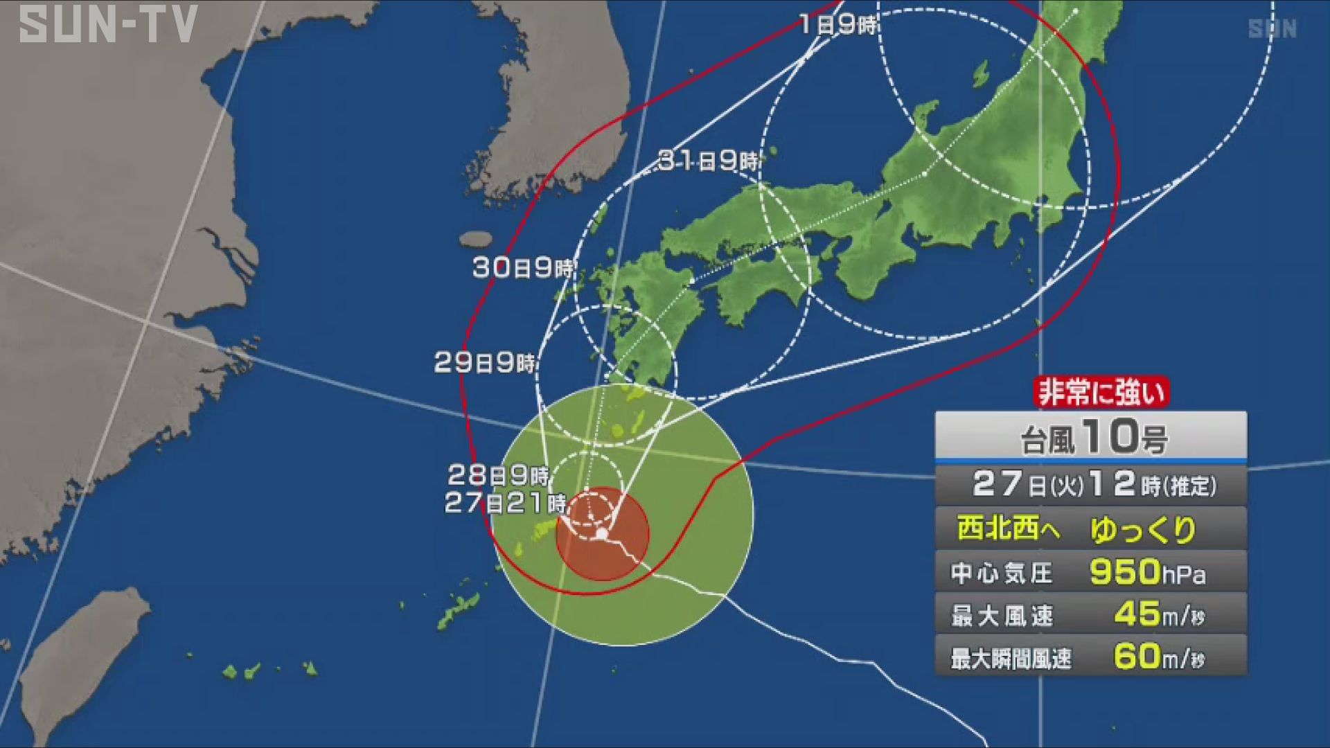 非常に強い台風10号は、奄美市の東にあってゆっくりした速さで西北西へ進んでいて、8月30日から31日にかけて兵庫県に接近する見込みです。