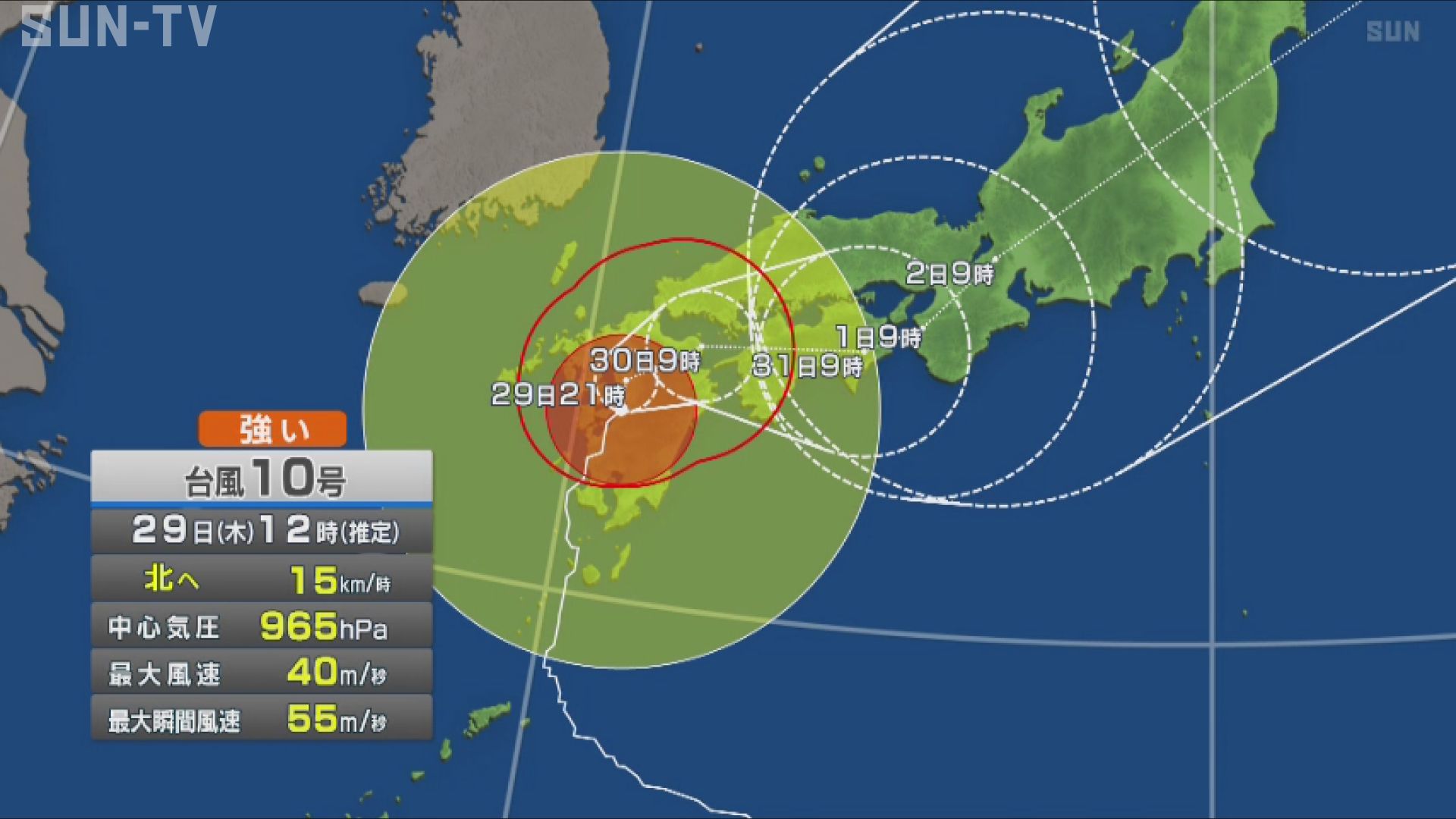 台風10号は29日朝、非常に強い勢力から強い勢力に変わり、午前11時時点で熊本県天草市付近を、1時間におよそ15キロの速さで北へ進んでいます。