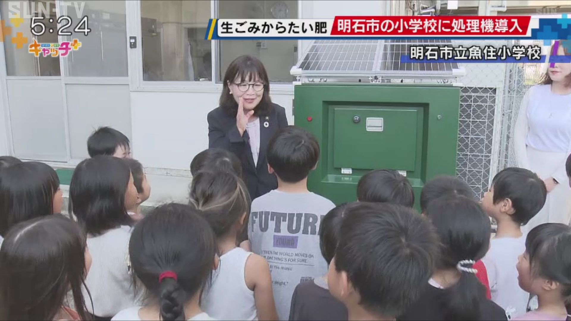 給食を作る時などに出た生ごみを減らそうと、明石市内の小学校で生ごみを肥料にする機械が試験導入されています。