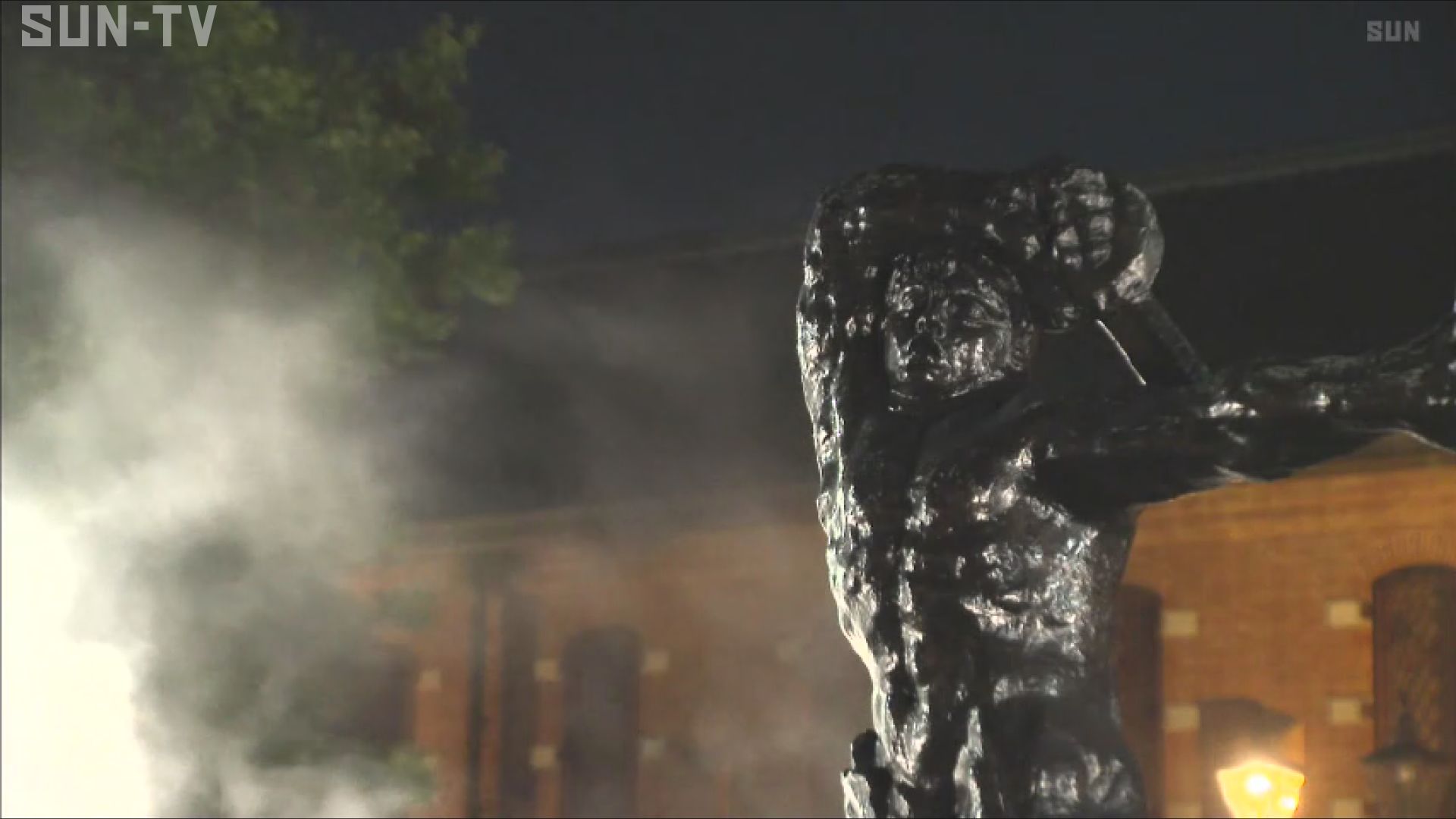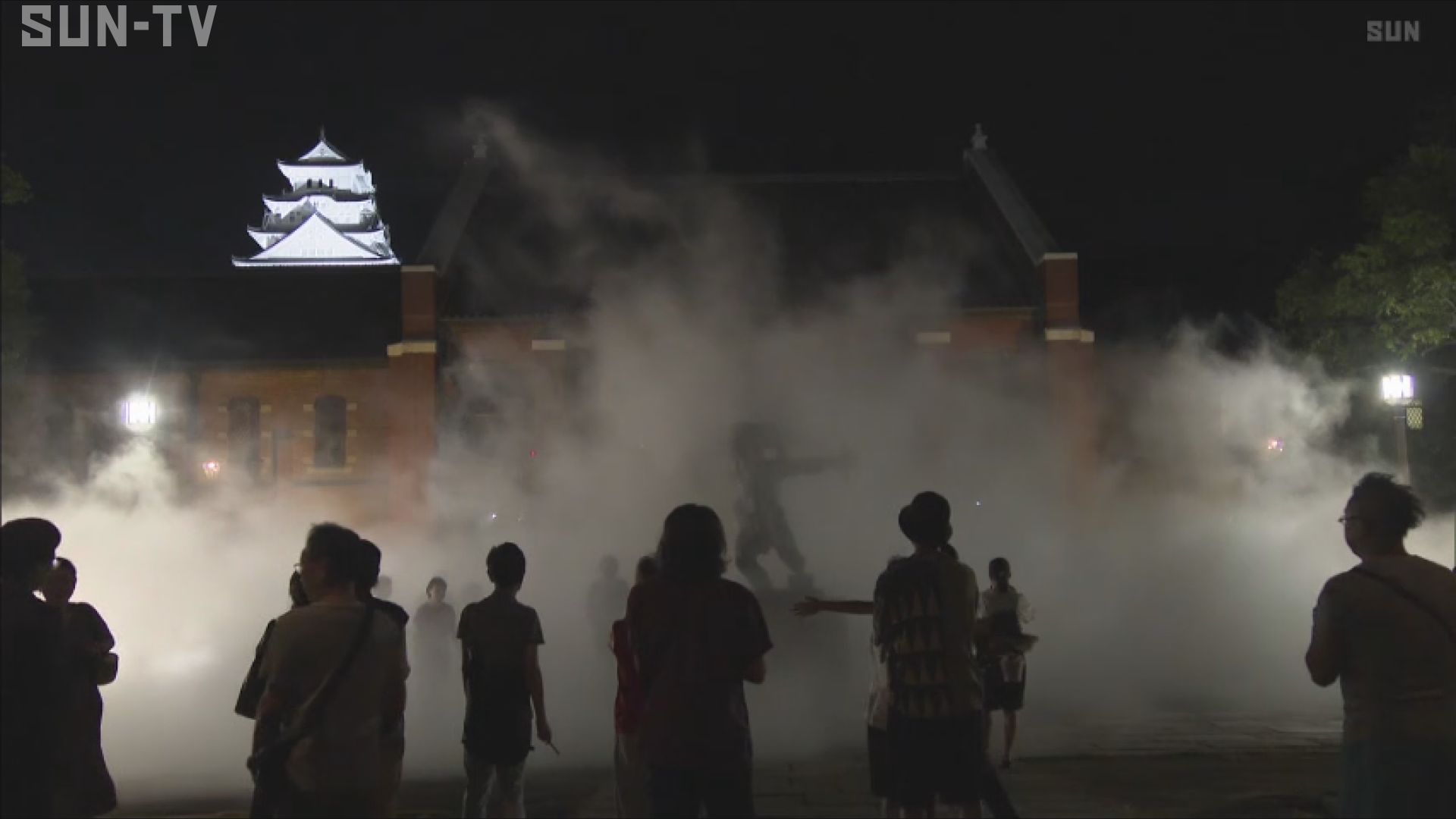 世界文化遺産・国宝姫路城を臨む夜の姫路市立美術館では、「霧のアーティスト」として世界的に知られる、中谷芙二子さんの作品が公開されています。