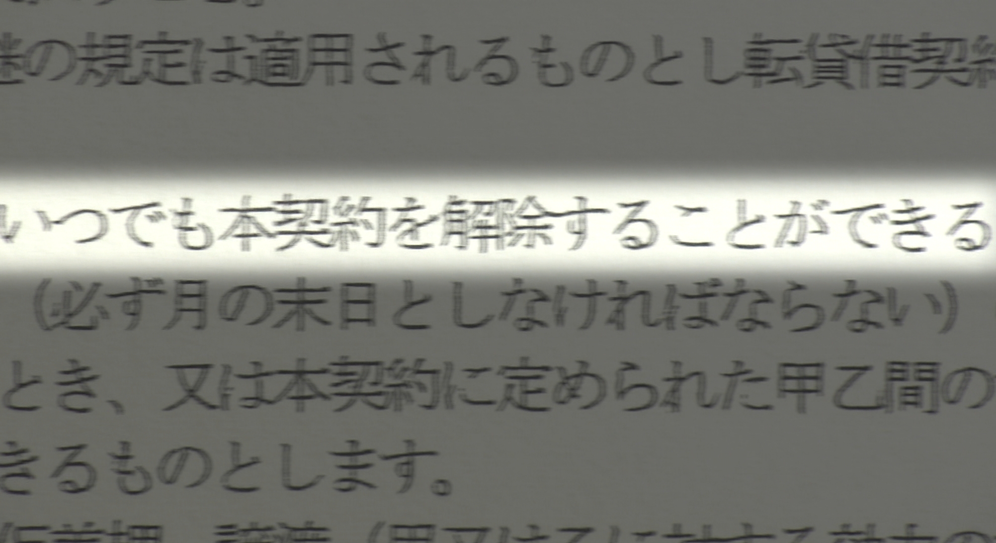 契約書には、「いつでも契約を解除することができる」と記載されていますが、不動産会社は、契約書に記載のない借地借家法(しゃくちしゃっかほう)を盾に、正当な理由がなければ解約できないと主張しているということです。