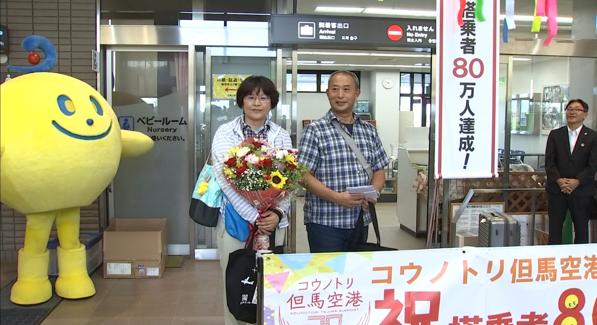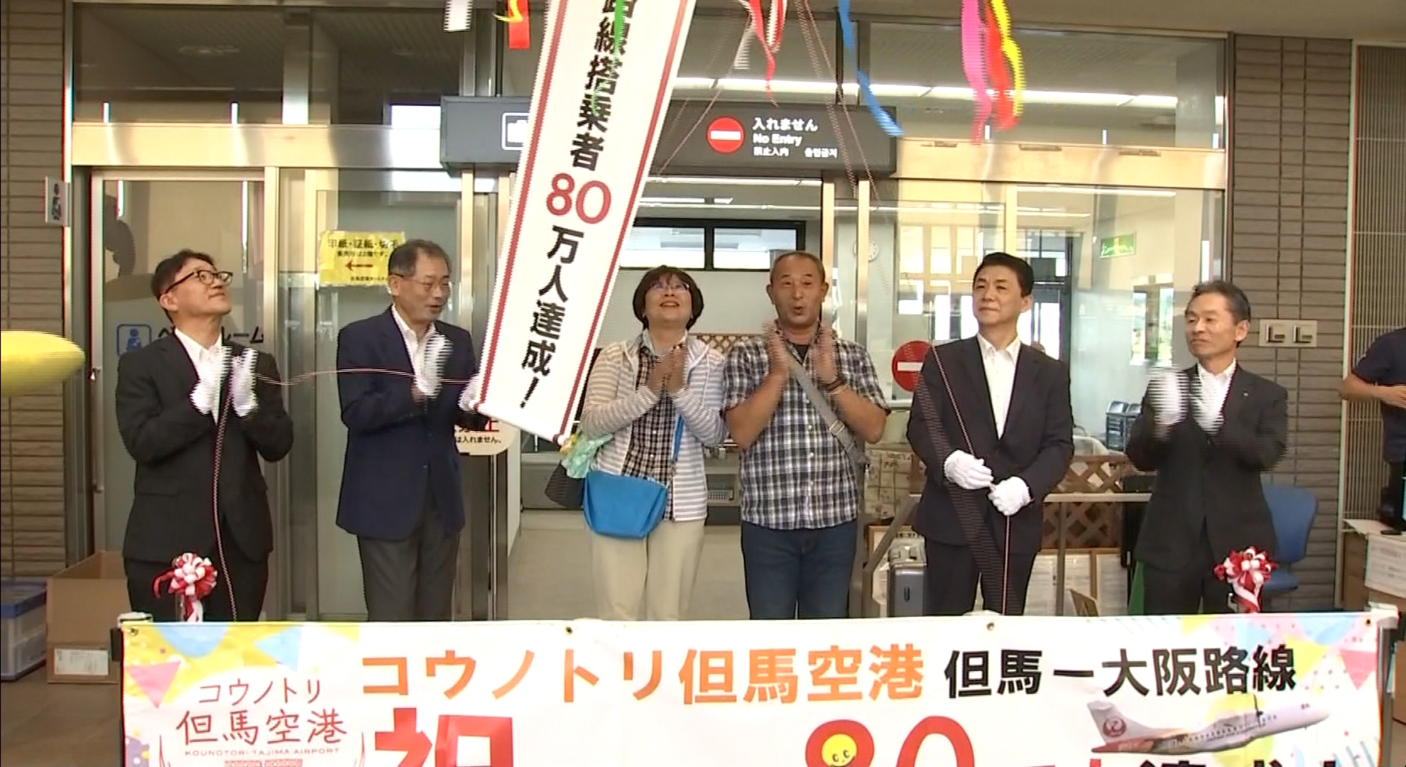 但馬地域と大阪を結ぶ兵庫県豊岡市のコウノトリ但馬空港の利用者が80万人を突破し、記念のセレモニーが開かれました。
