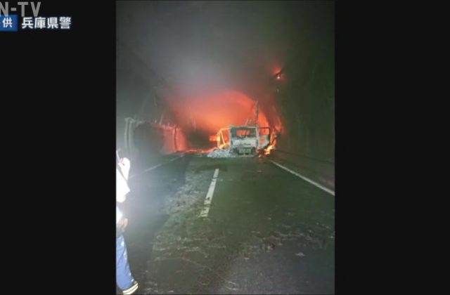 警察によりますと、午前8時50分ごろ、兵庫県姫路市にある山陽自動車道下りの書写山第2トンネル入り口付近で、10トントラックが前を走っていた2トントラックに追突しました。
