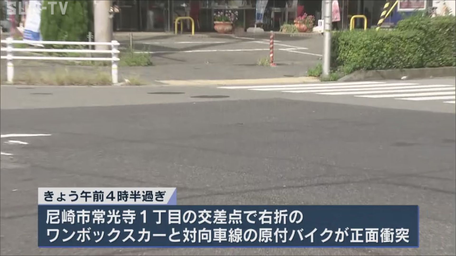 尼崎市常光寺1丁目の交差点で、右折しようとしたワンボックスカーと対向車線を走っていた原付バイクが正面衝突しました。