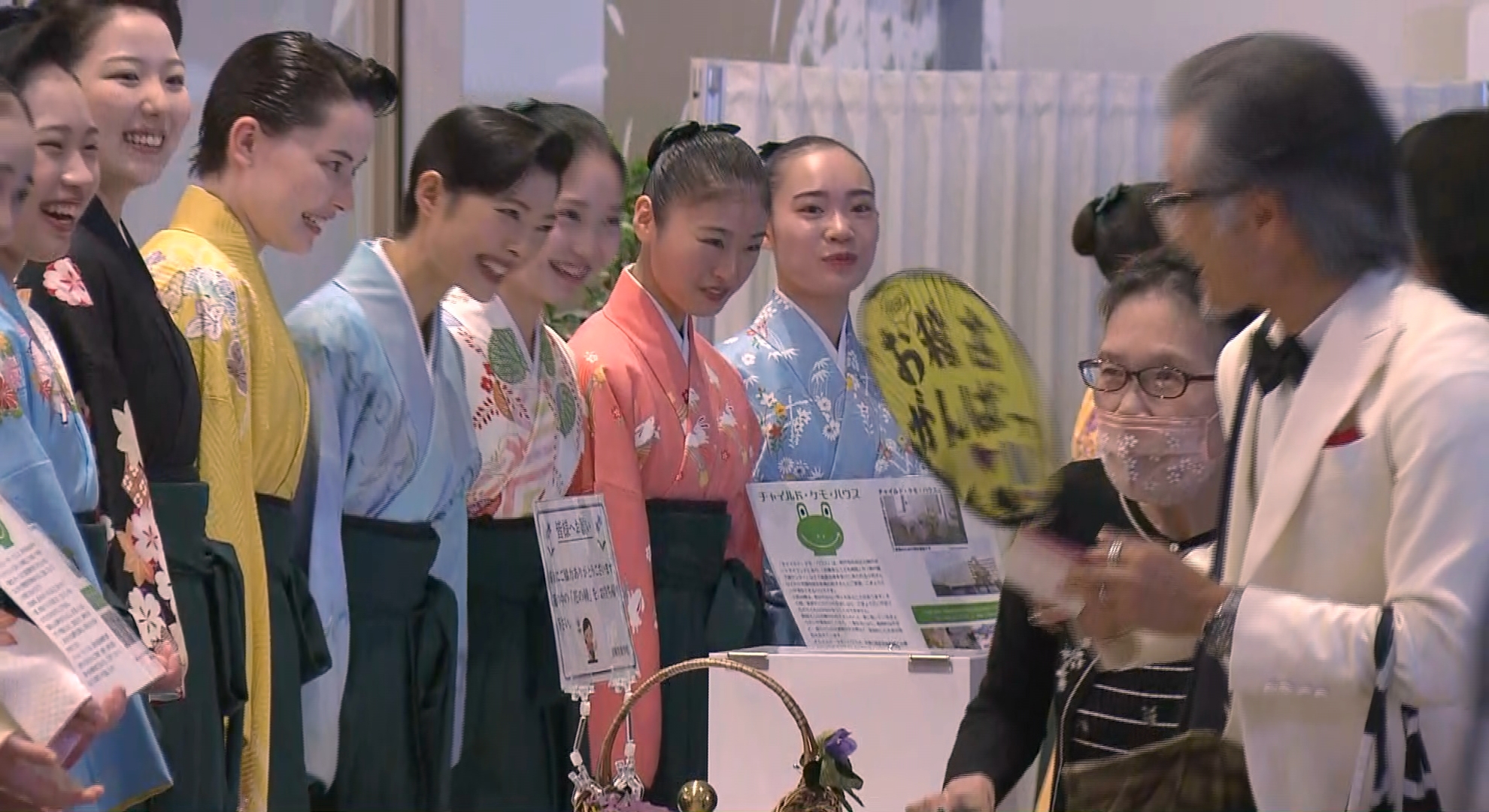 11日は午前中から劇場に多くのファンが詰めかけ、色鮮やかなはかま姿の生徒たちが、スミレ科の花「ビオラ」の種を配ったり感謝の言葉をかけたりして交流を深めていました。