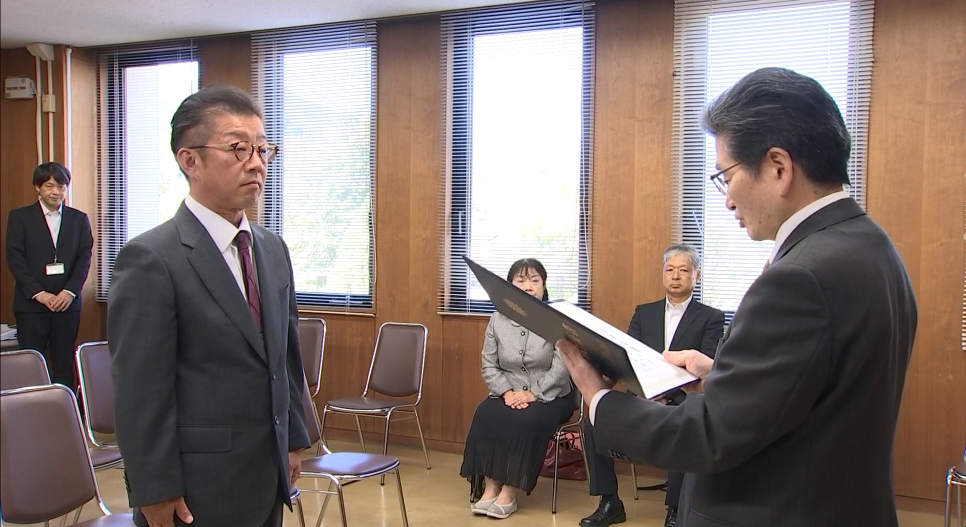 10月20日に投開票が行われた兵庫県養父市長選で、現職を抑え初当選を果たした大林賢一さんに、当選証書が手渡されました。
