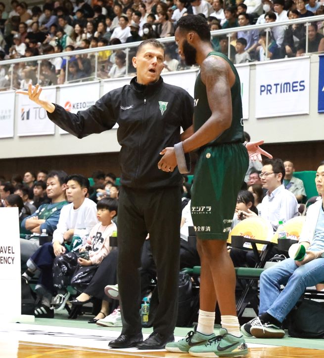 神戸ストークス プレドラッグ・クルニッチ ヘッドコーチ、(右は 24モリス・ウデゼ)=西宮市立中央体育館=/©B.LEAGUE