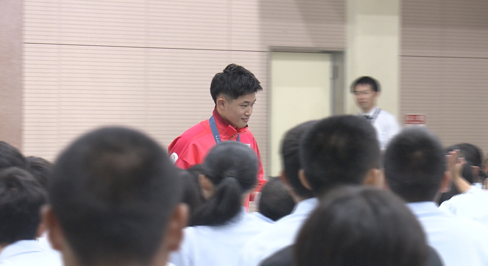 高司中学校は玉井選手の母校で生徒会から要望を受けた玉井選手が、母校の文化祭をサプライズ訪問しました。