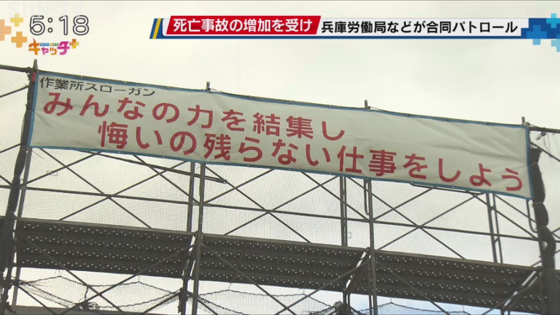 このパトロールは、労働災害が多く発生している建設現場での死亡事故などを防ごうと兵庫労働局や神戸東労働基準監督署などが合同で行いました。