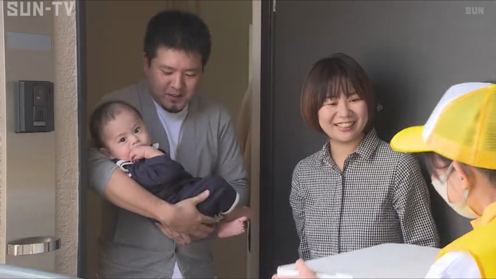 出発した配達員は早速、市内の子育て世帯を訪問し、育児用品を届けました。