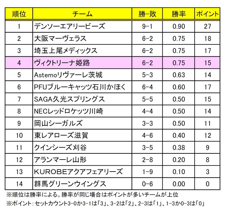 首位デンソーと1勝1敗で星を分け、6勝2敗のヴィクトリーナ姫路はSVリーグ4位をキープしている。