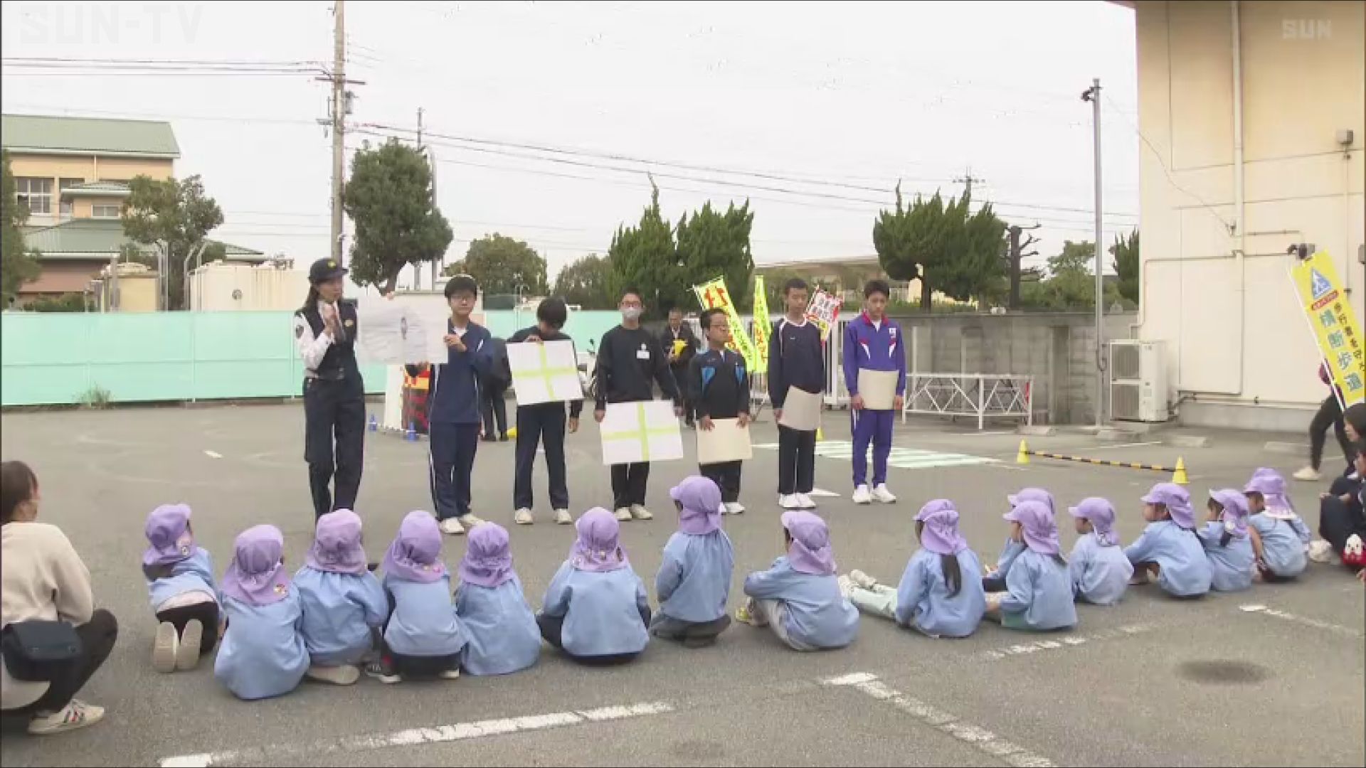 この交通安全教室は交通ルールを守ることの大切さを年齢の近い中学生から分かりやすい言葉で伝えてもらおうと実施されたもので、高砂市立荒井こども園に通う園児たちが参加しました。