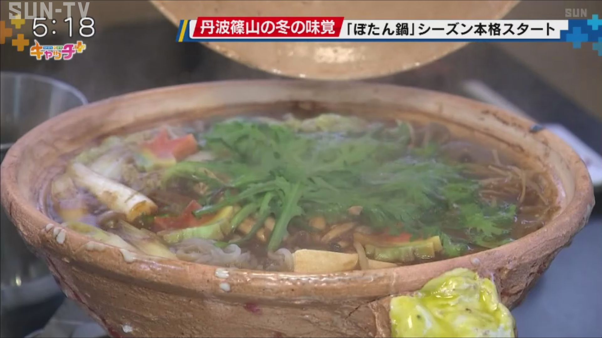 ぼたん鍋は国産の猪肉と地元の野菜を特製の味噌だしで煮込んだ料理で、丹波篠山市内ではおよそ40店舗が提供。