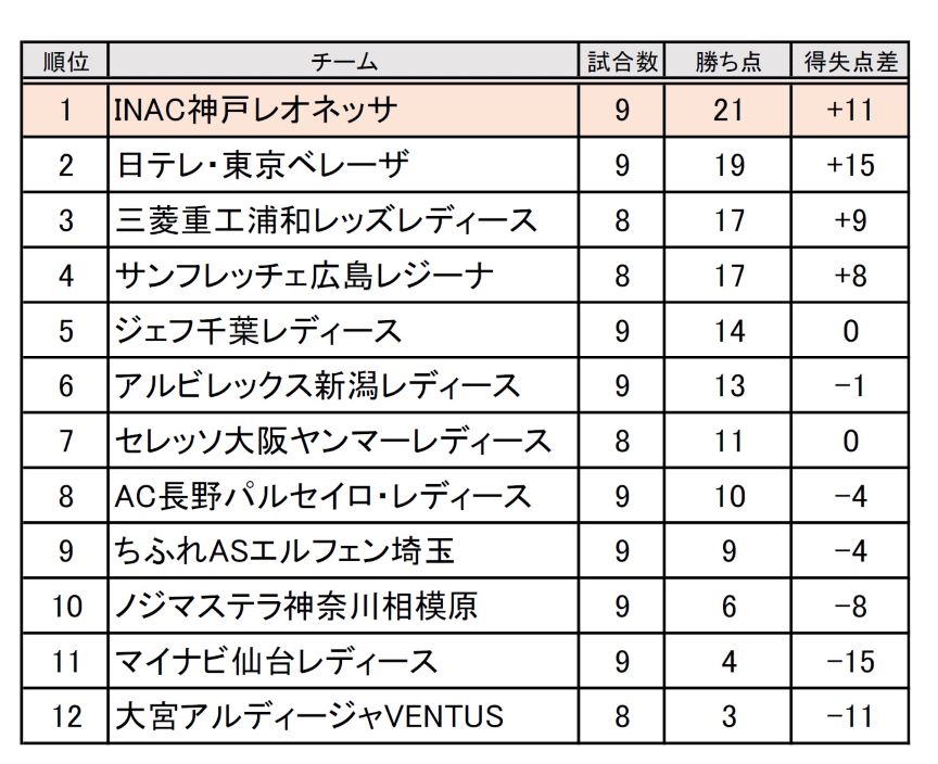 首位INAC神戸は次節(24日)、アウェイで5位ジェフ千葉レディースと戦ったあと、第11節(12月1日)、アウェイでセレッソ大阪ヤンマーレディースと戦い、後半戦へ折り返す。