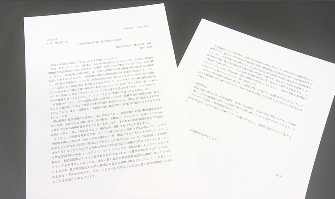 安岡教授は11月28日、西宮市の石井登志郎市長宛てに要望書を提出。患者からの副反応疑いの報告依頼について、医師が真摯に向き合い適切に報告するよう促すほか、健康被害を訴える市民が自らPMDAのホームページで報告したり、市町村の窓口で報告書を記入したりできることを周知することを求めました。今後、兵庫県に対しても同様の要望書を提出する予定です。