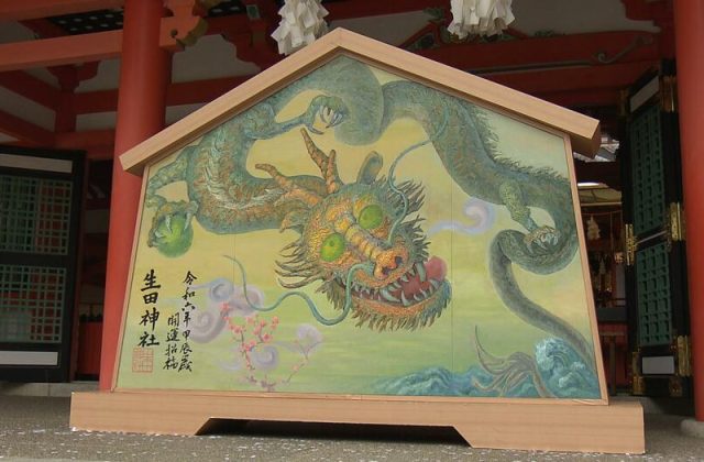神戸市中央区の生田神社で29日、来年の干支「巳」を描いた大きな絵馬が奉納されました。