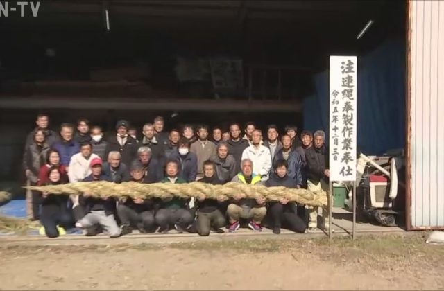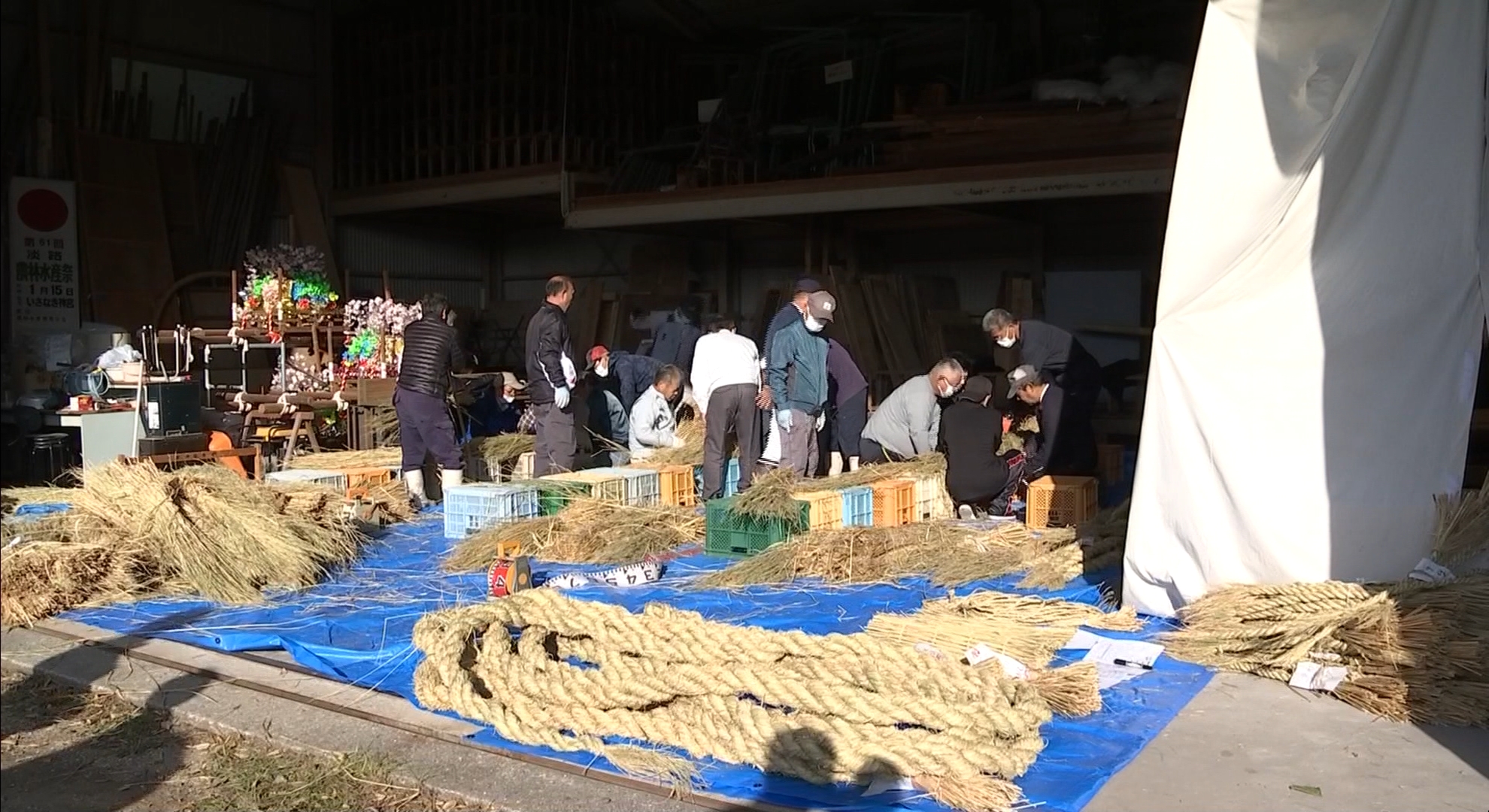 集まった地元の人たちは正門にかける長さ4メートル20センチ、直径27センチのしめ縄などを仕上げようと、丁寧にわらをより合わせていました。