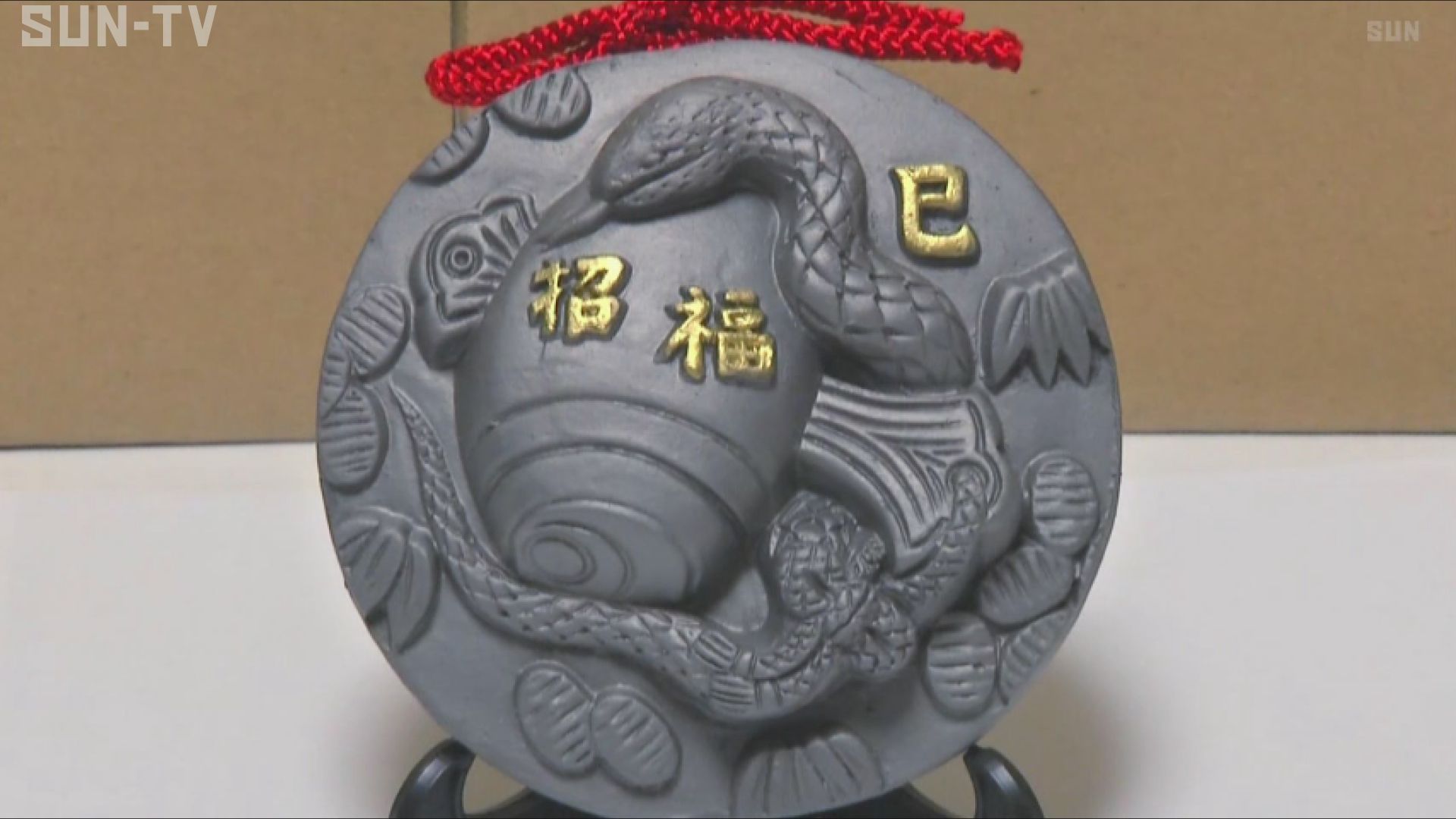 400年の歴史を持つ特産品「淡路瓦」に描かれたのは、富の象徴とされる、小槌をぐるりと巻き込む来年の干支「ヘビ」です。