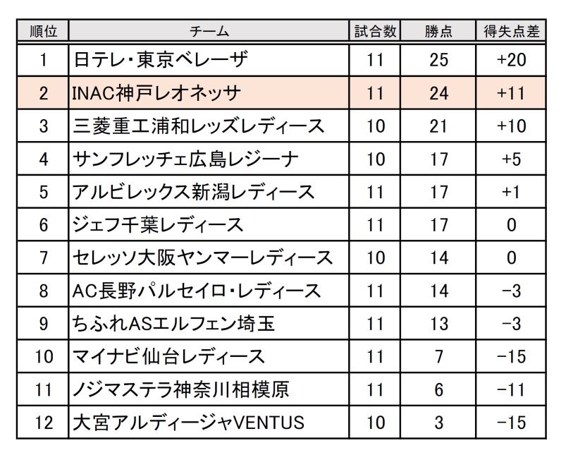 1敗を喫したINAC神戸は首位を明け渡し、2位でリーグ後半戦へ折り返した。