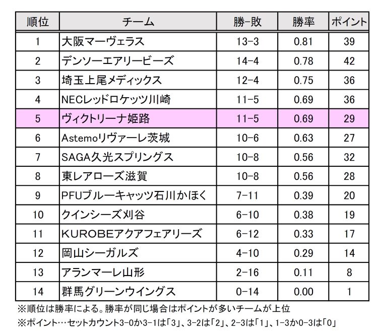 11勝5敗のヴィクトリーナ姫路は、ここまで8カードを消化し連敗はない。