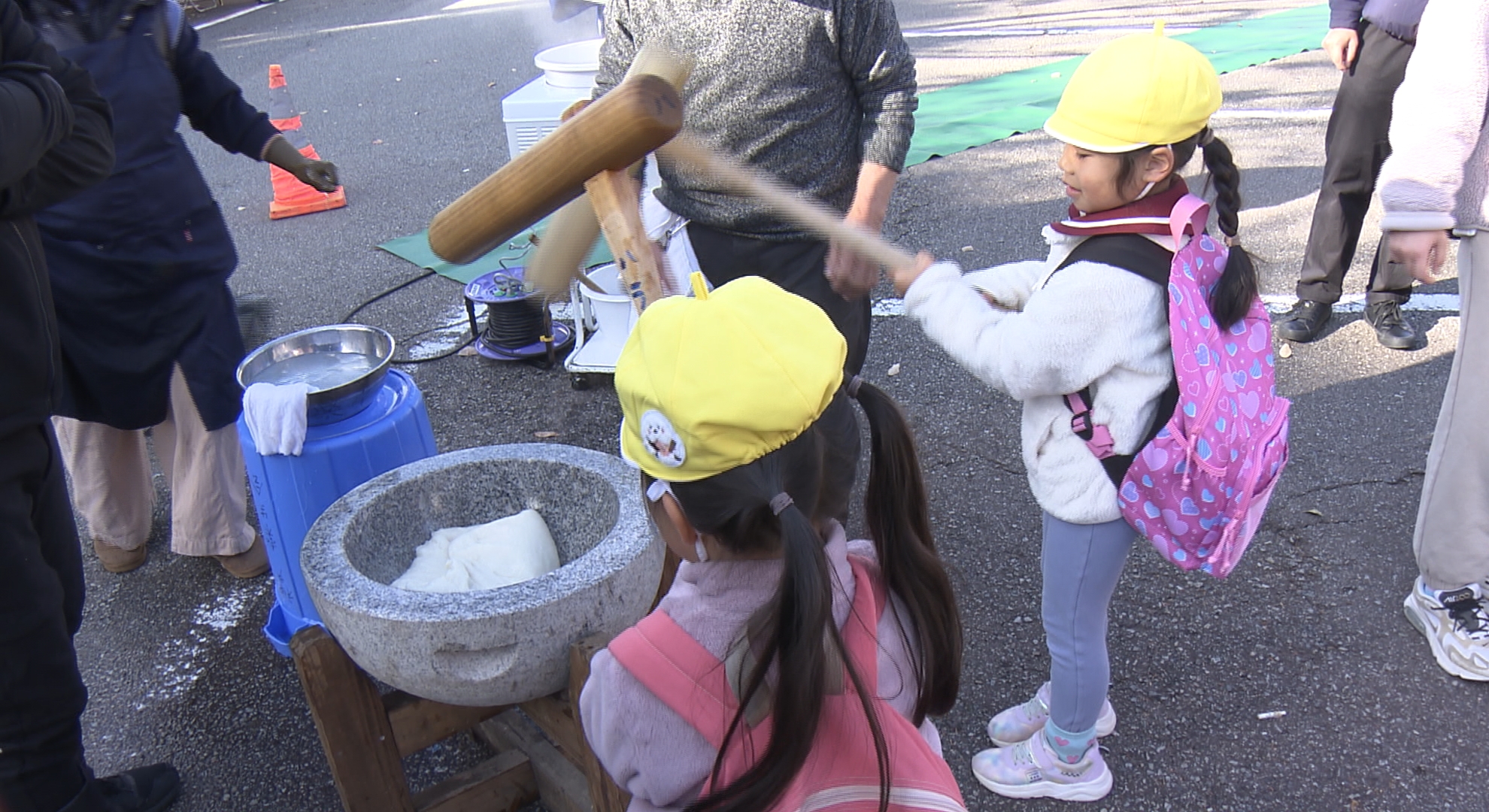 子どもたちに日本の伝統行事を伝えようと、神戸市灘区の王子動物園前でこの時期恒例の餅つき大会が開かれました。