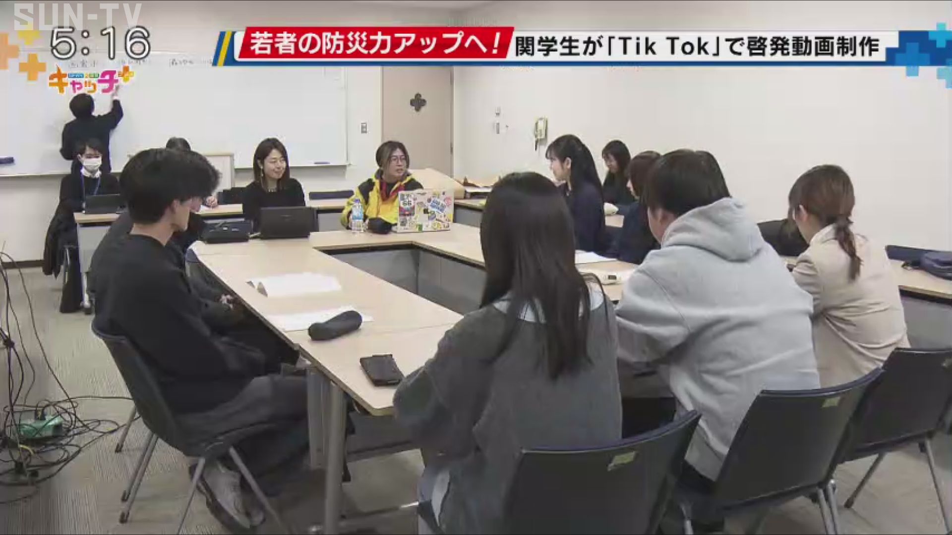 講師を務めるのは、教育メディア事業を展開する企業の代表の大崎龍史さんで、学生たちは早速「防災クイズ」と「インタビュー」を撮影。