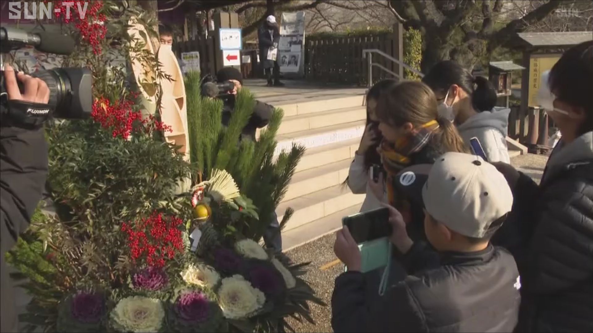 訪れた観光客らは完成したジャンボ門松を見て、ひと足早く新春の雰囲気を楽しんでいました。