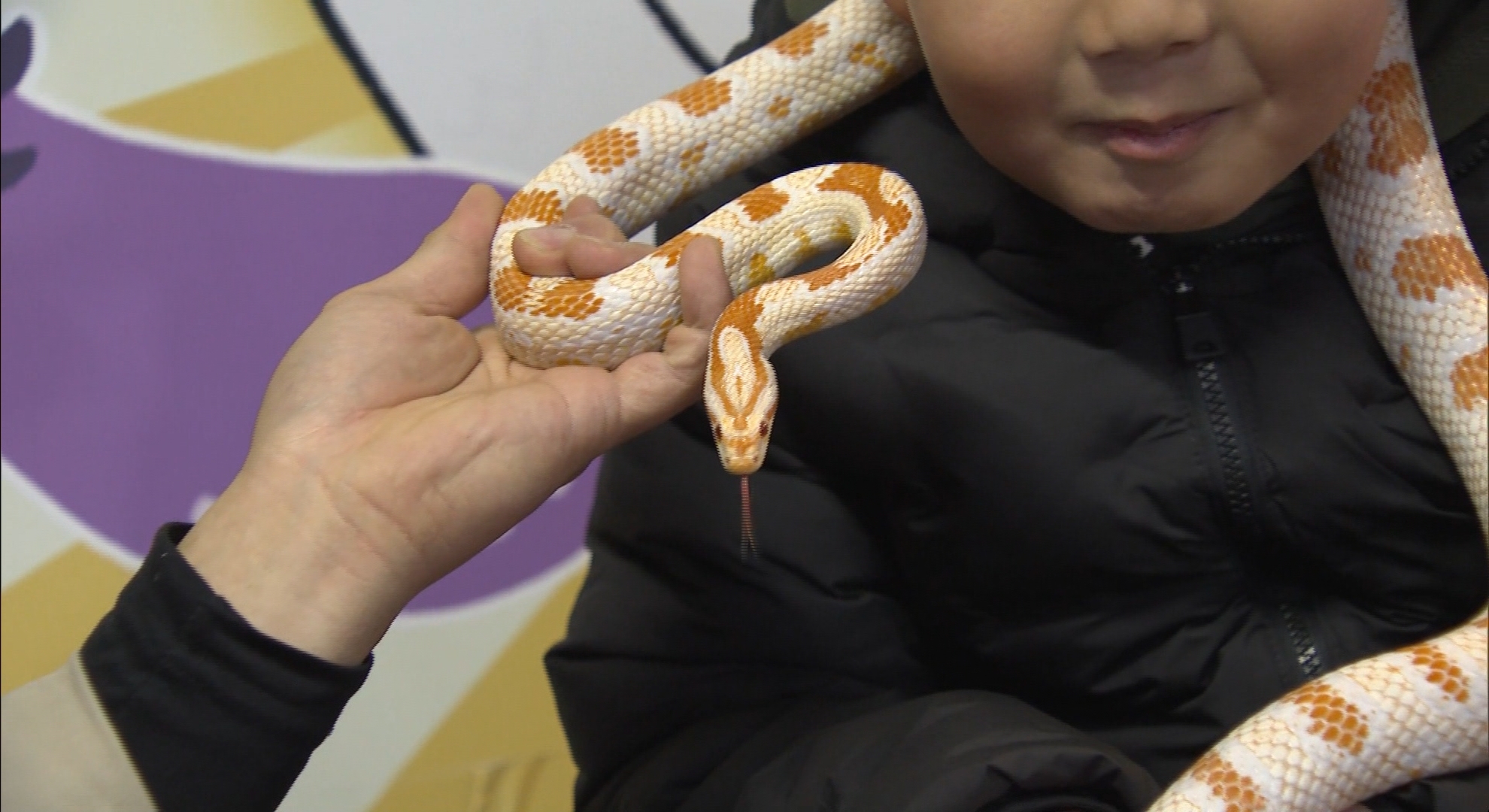 姫センでは、来園者に幸運が訪れるよう日替わりで4種類のヘビとの記念撮影を開始。
