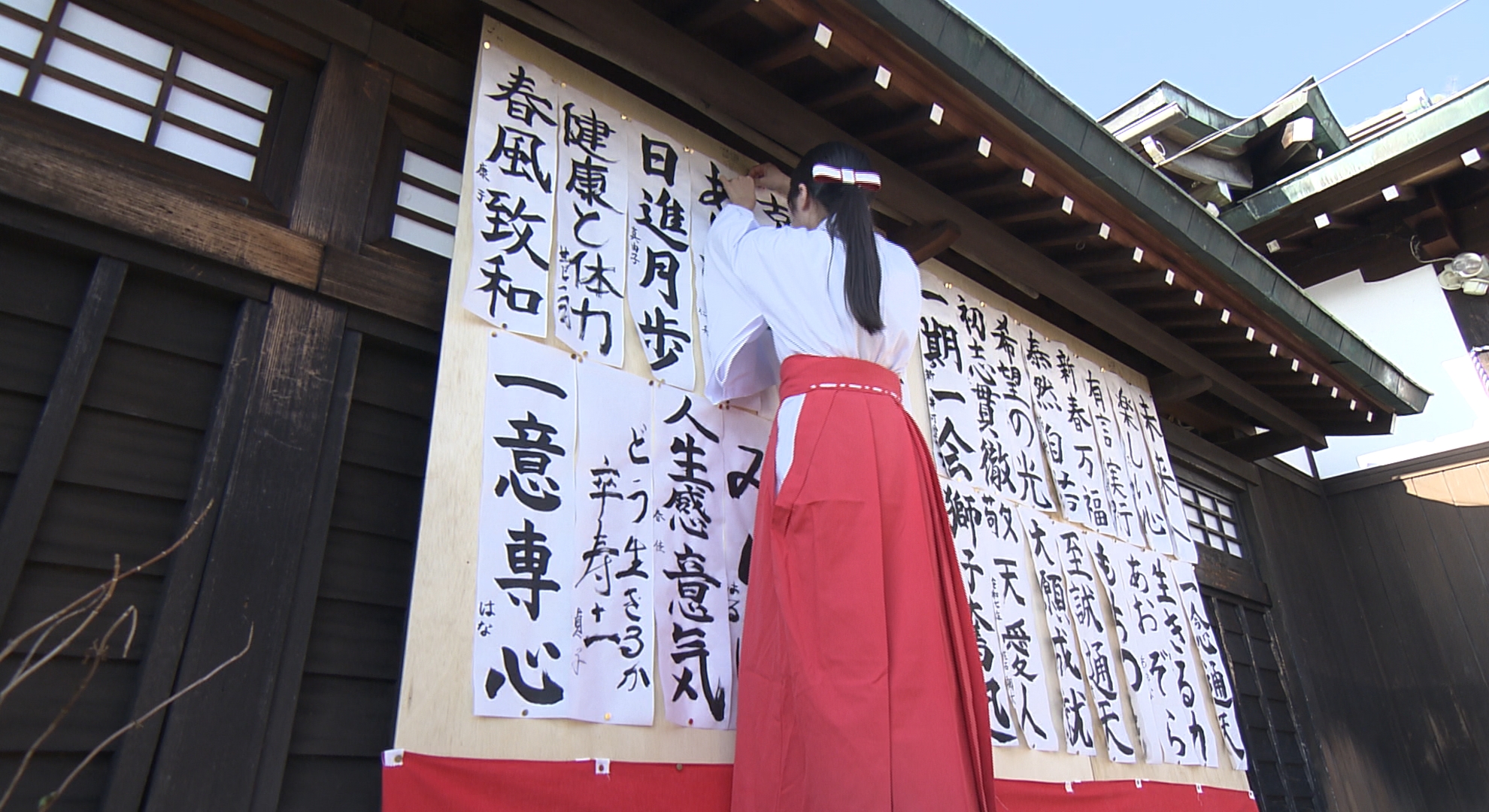 参拝客が書き上げた文字は境内に飾られたあと、奉納されるということです。