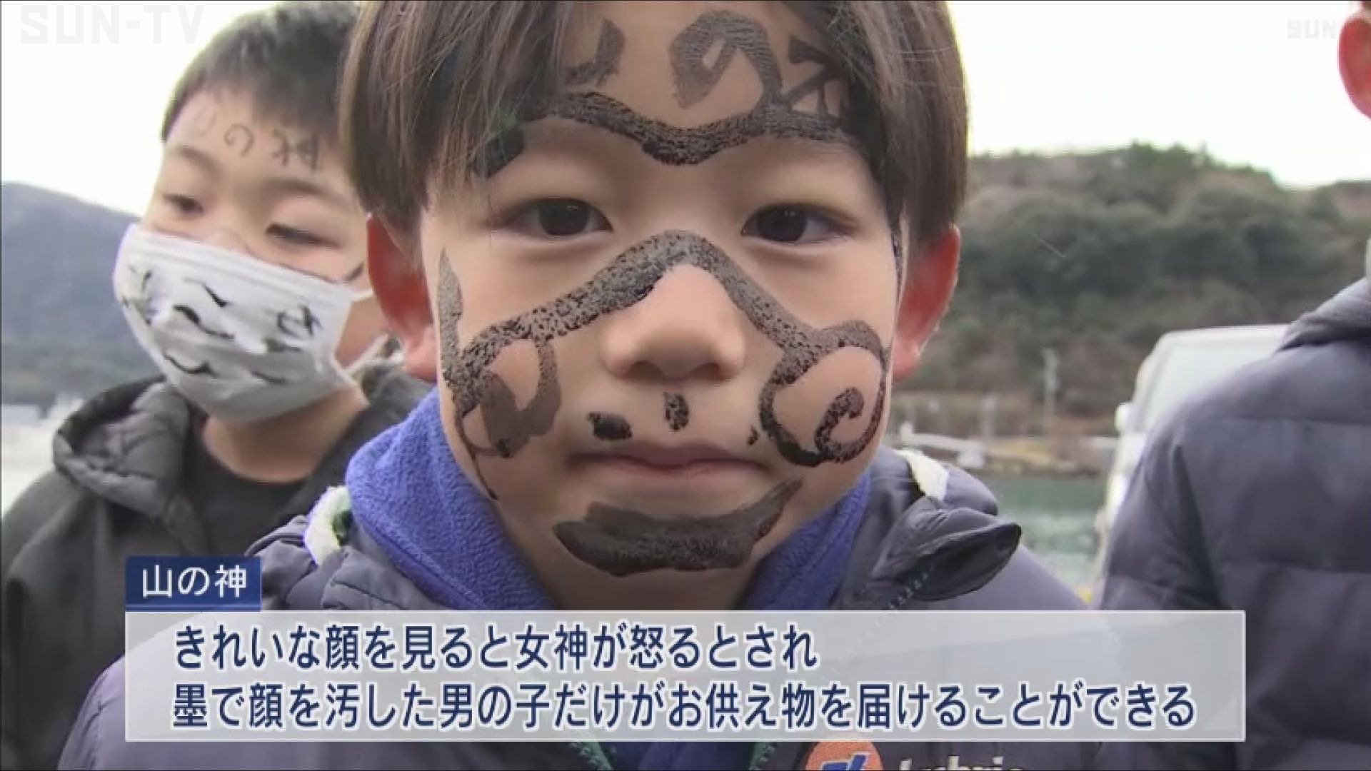 沖浦の山の神は嫉妬深い女神と言われ、きれいな顔を見ると怒ってしまうため、墨で顔を汚した男の子だけがお供え物を届けることができます。