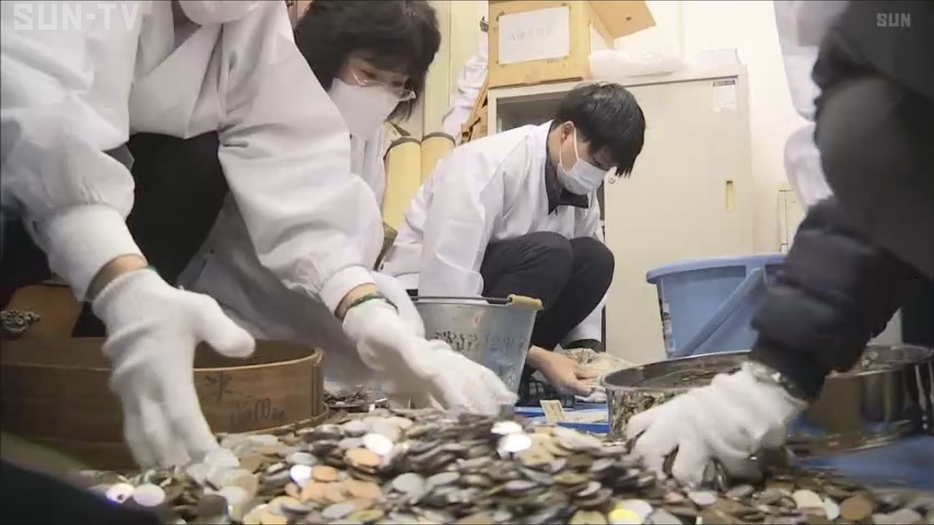 地元の信用金庫の職員らが、袋に入ったさい銭を床いっぱいに広げて、計算機を使って金額を勘定していきました。