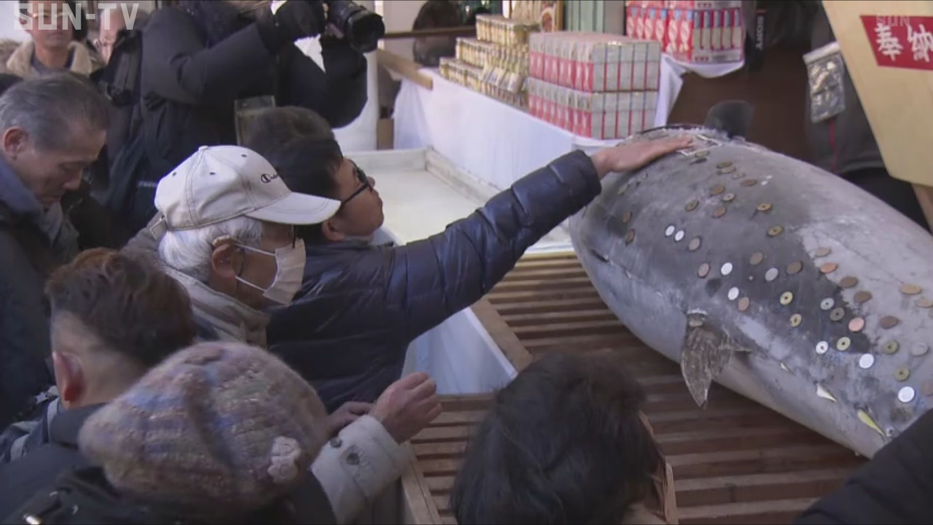 奉納されたマグロは鹿児島県産で、全長約2メートル、重さは200キロほどで、刺し身にすると約1000人分になるということです。