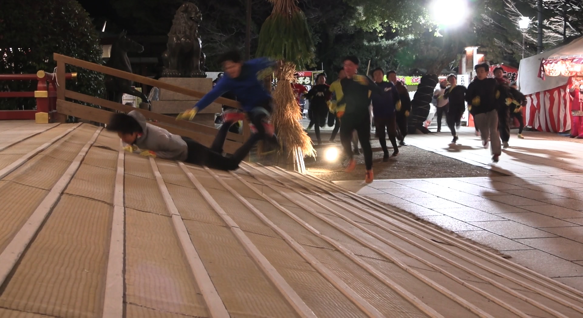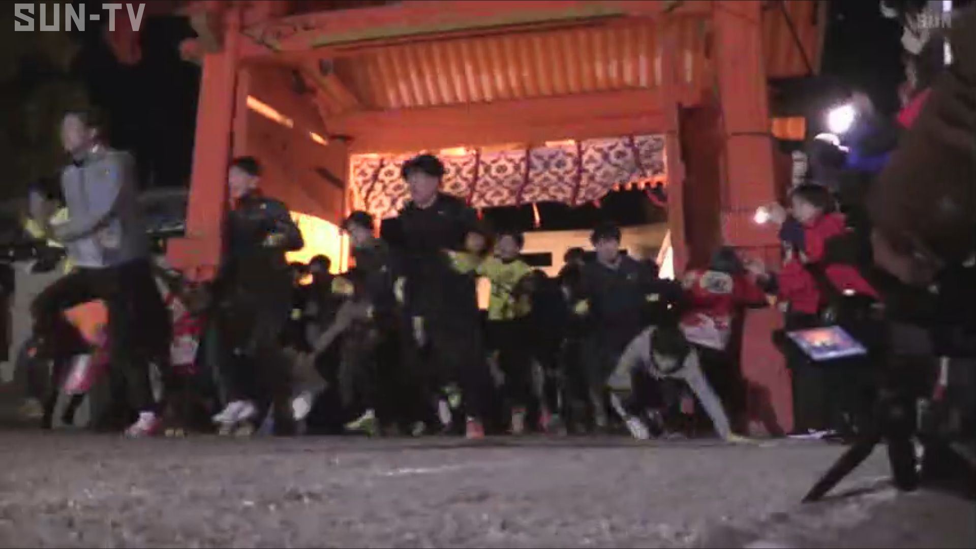 この冬1番の寒さの中、参拝一番乗りを目指し門から本殿までのおよそ230メートルを駆け抜けます。